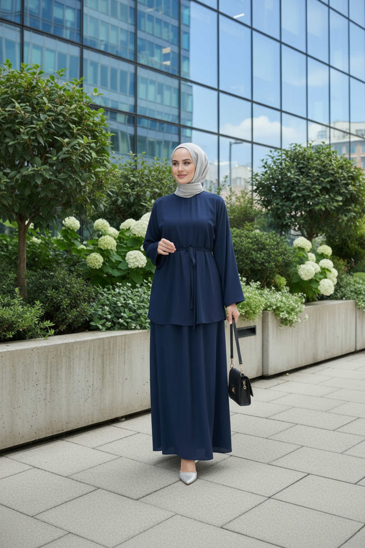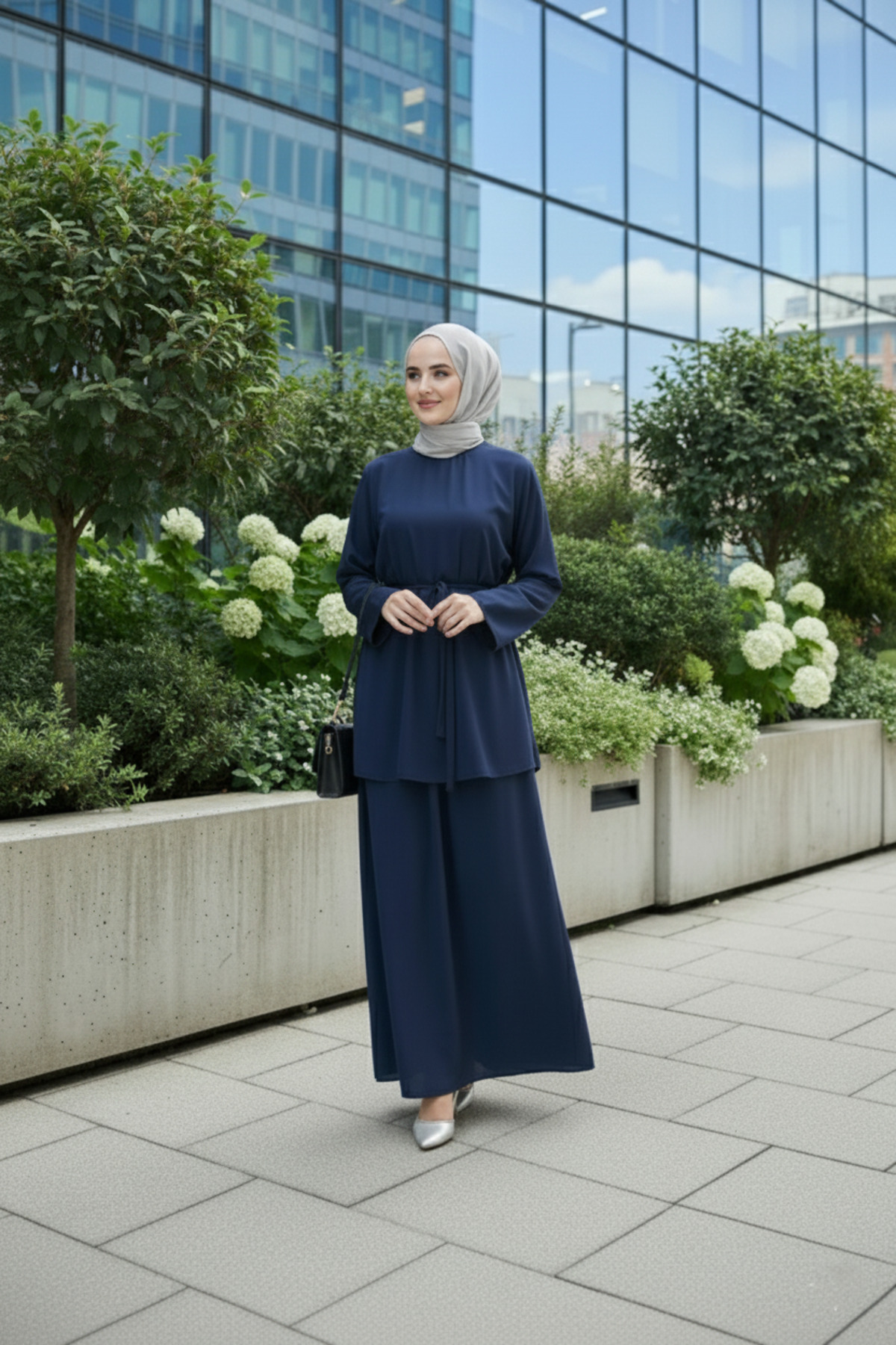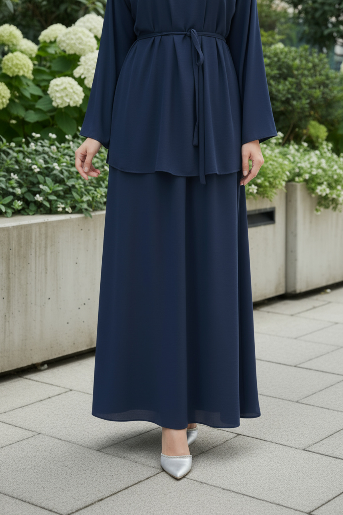 MEDİNE İPEĞİ KEMERLİ KLOŞ BLUZ KLOŞ ETEK TAKIM- LACİVERT - GENİŞ BEDEN ARALIĞI MEDİNE İPEĞİ KEMERLİ KLOŞ BLUZ KLOŞ ETEK TAKIM- LACİVERT - GENİŞ BEDEN ARALIĞI H5036 40-42