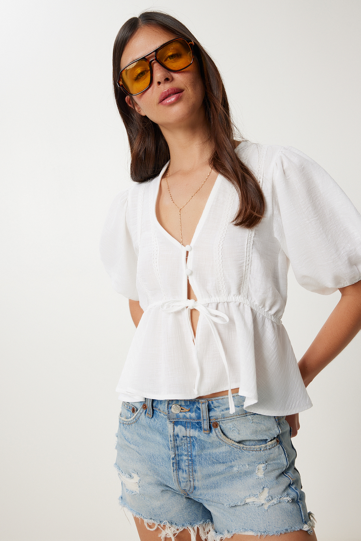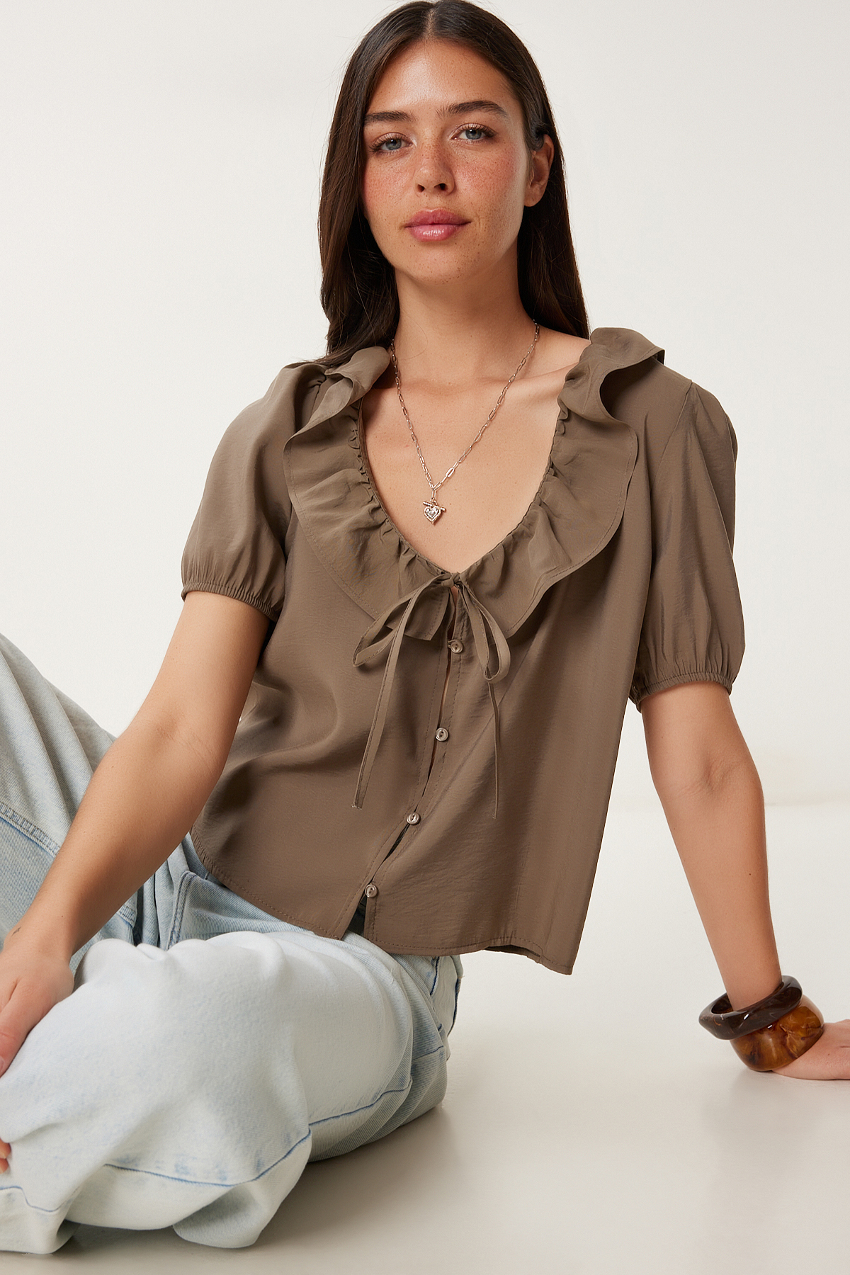 Kadın Ekru Volanlı Bağlama Detaylı Modal Bluz LMX0095 Kadın Ekru Volanlı Bağlama Detaylı Modal Bluz LMX0095 40
