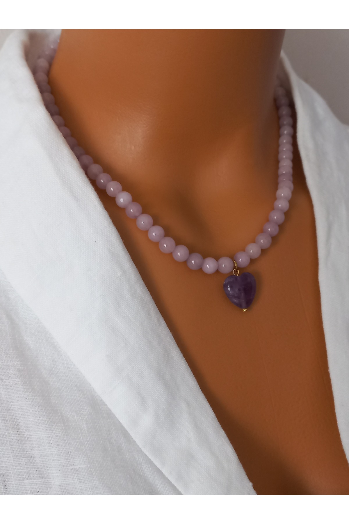 Doğal taş kolye;Ametist kalp kolye ucu ve kunzit taşlı kolye Doğal taş kolye;Ametist kalp kolye ucu ve kunzit taşlı kolye L0561 43 cm
