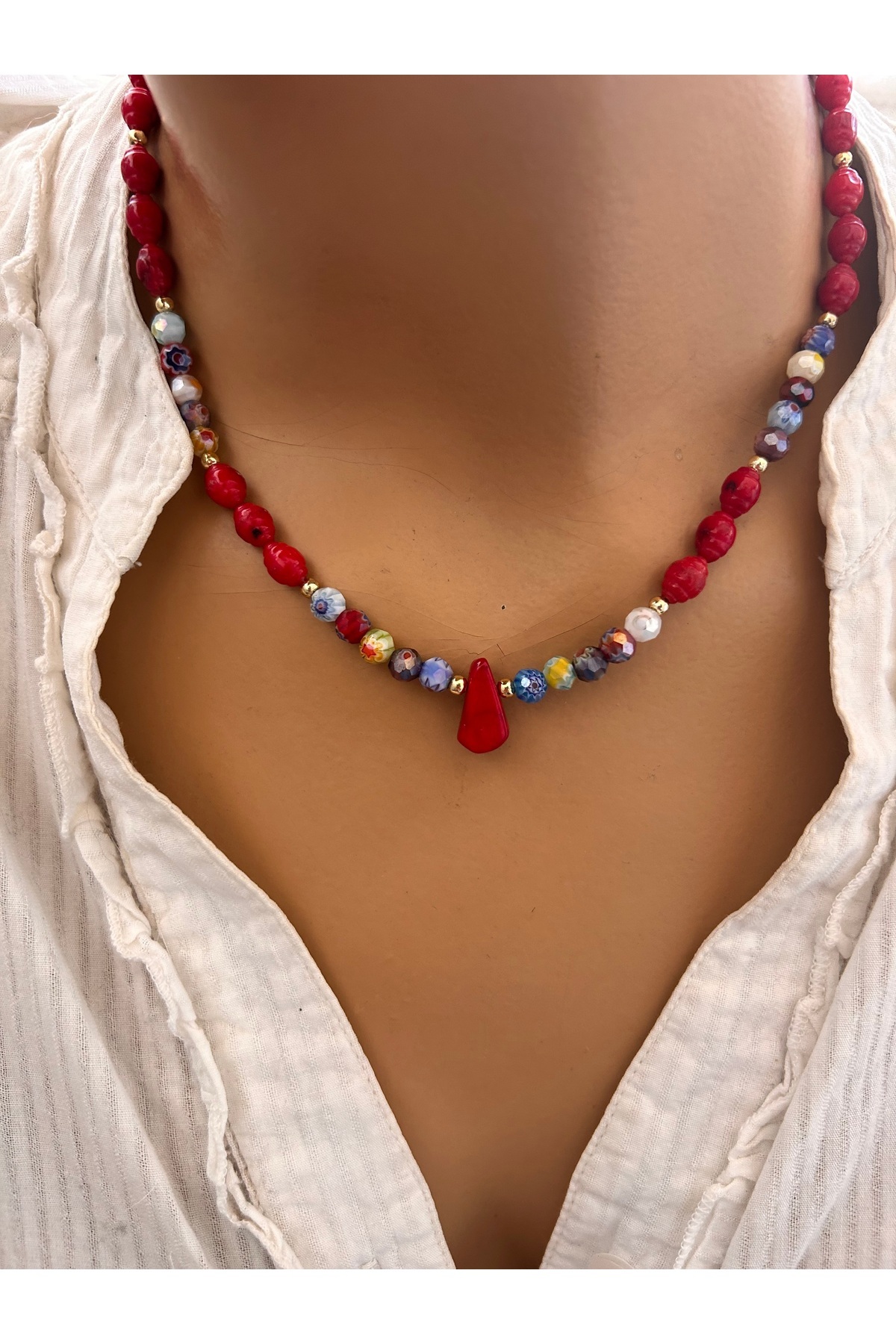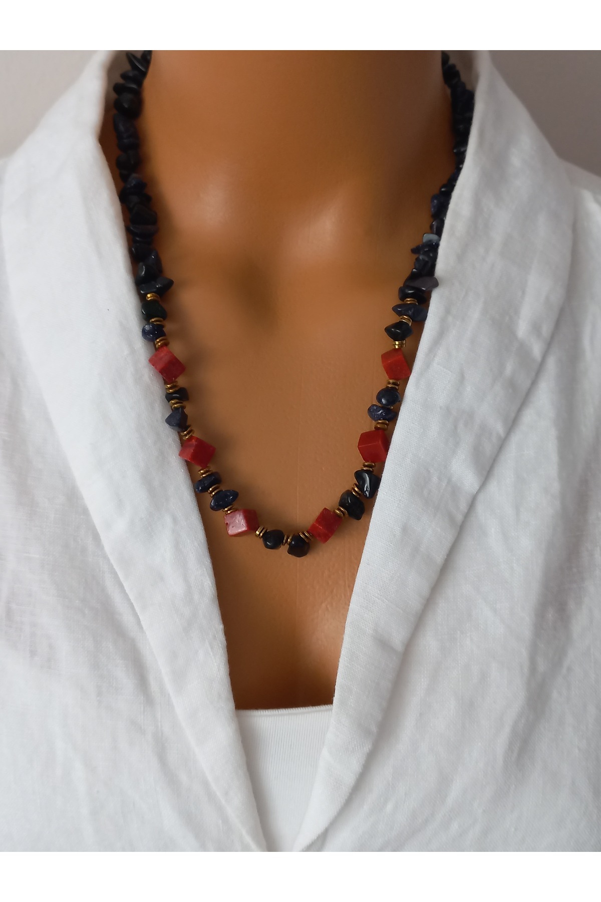 Doğal taş kolye;Kırmızı çim mercan ve lacivert yıldız taşı ile tasarlanmıştır. Doğal taş kolye;Kırmızı çim mercan ve lacivert yıldız taşı ile tasarlanmıştır. L0567 43 cm