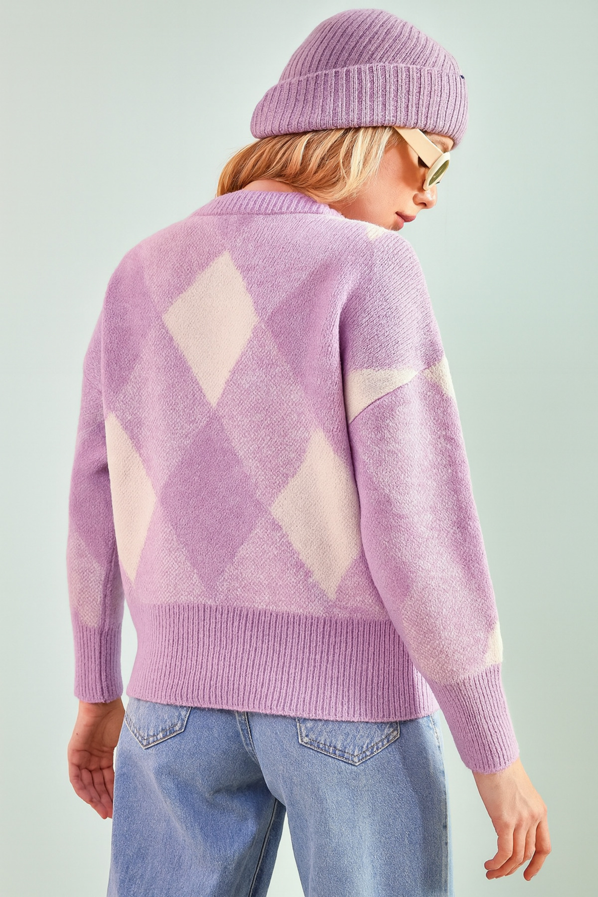 Kadın Kare Desenli Bisiklet Yaka Triko Kazak Kadın Kare Desenli Bisiklet Yaka Triko Kazak K2504 Standart