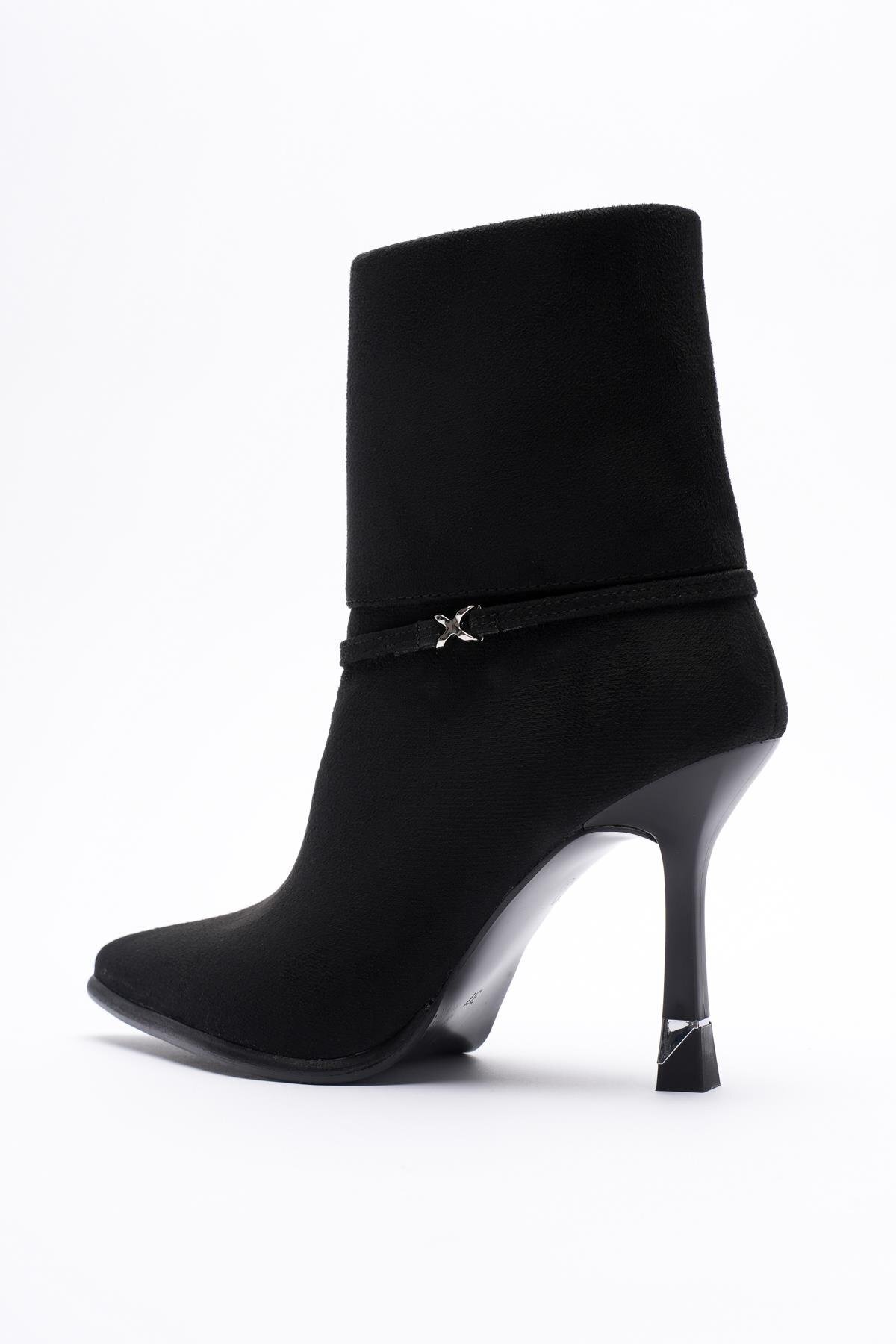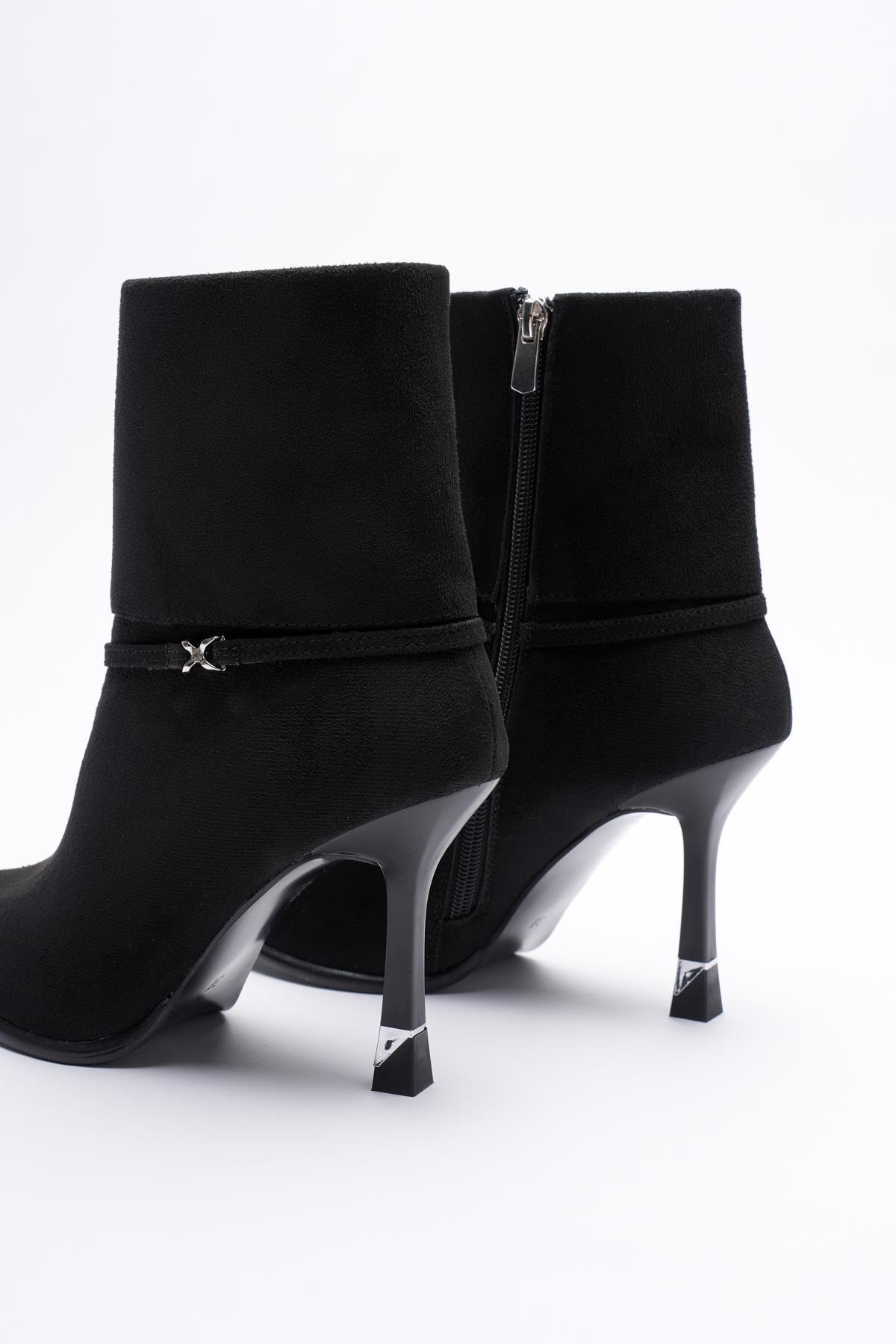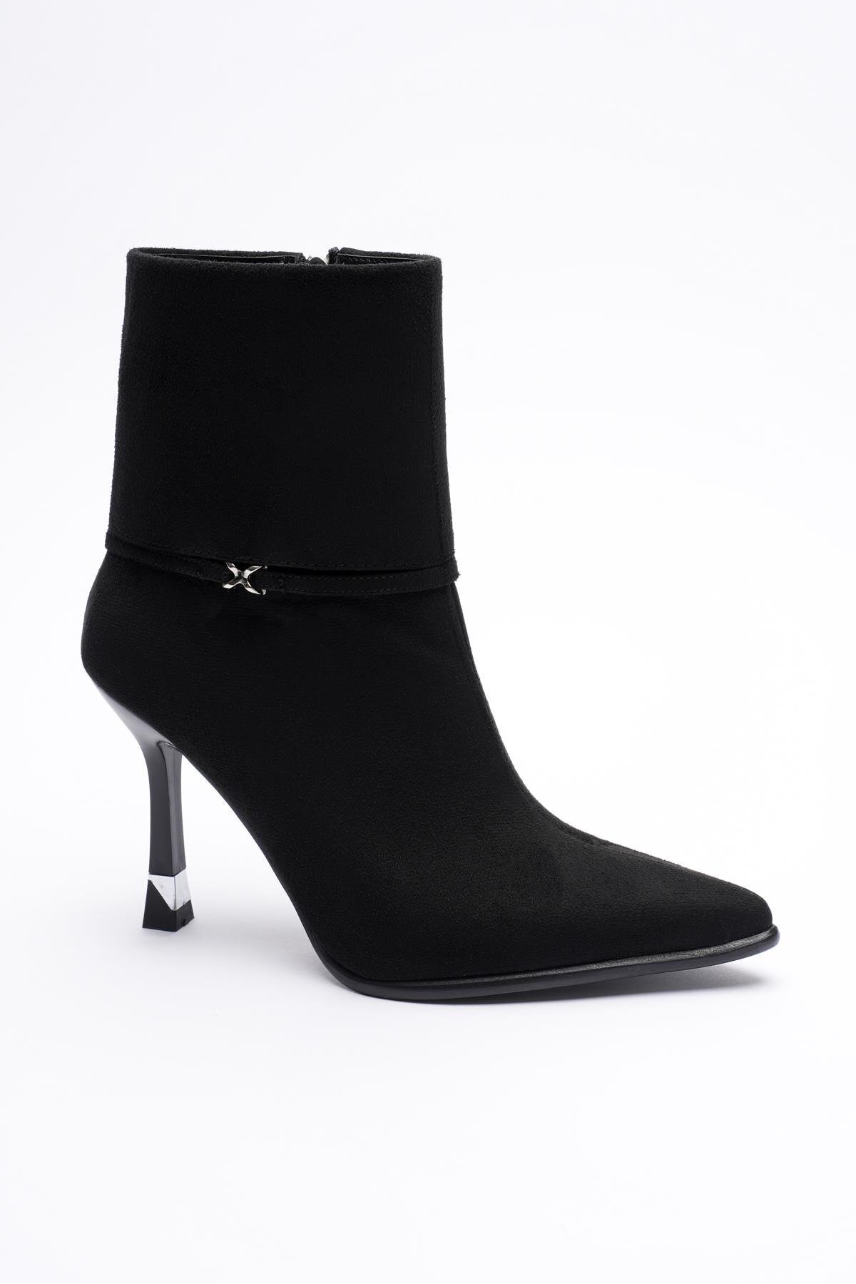 Kadın Süet Bot Yüksek Topuklu Fermuarlı Platin Aksesuarlı Siyah Nuvia Kadın Süet Bot Yüksek Topuklu Fermuarlı Platin Aksesuarlı Siyah Nuvia 52-09-2007 40