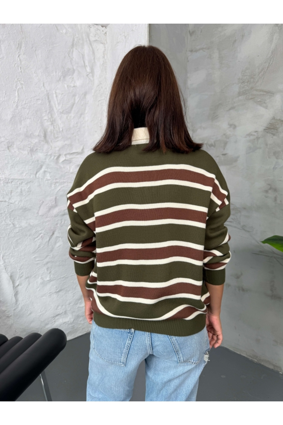 Haki Çizgili Polo Yaka Triko Kazak Haki Çizgili Polo Yaka Triko Kazak 34101 Standart